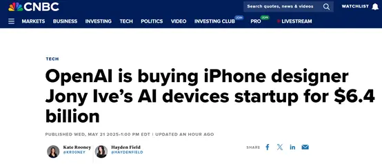 今天凌晨1点,CNBC消息,OpenAI将以64亿美元全资收购,前苹果iPhone设计师乔尼・艾维的AI设备初创公司io,这一交易将推动OpenAI进军硬件领域。