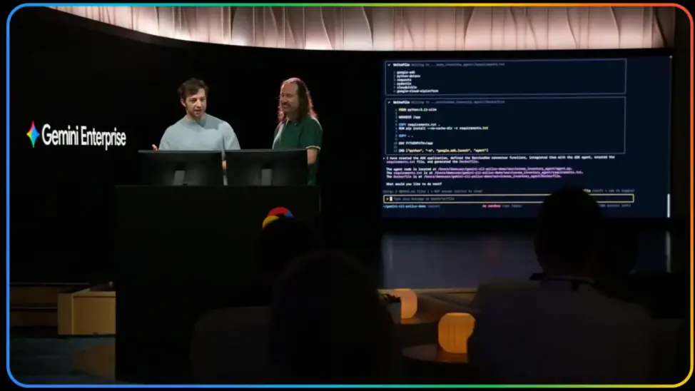 你今天就可以在Vids将自己的幻灯片转换成视频。就这些。我们首先向您展示了Gemini企业版如何让团队中的任何人都能轻松构建强大的Agent,无论是使用直观的可视化构建器,还是通过自然语言或Gemini CLI。然后我们把这种能力用于在短短几分钟内编排一个全方位营销活动。我们从深入的市场调研到在ServiceNow中管理库存,再到起草团队沟通,最后到创建令人惊艳的可即刻使用的社交媒体,搭配Veo的魔力。Gemini企业版不仅仅是一个聊天界面。它是一个端到端的AI系统,将你的数据统一起来,将您的工具和团队整合,将数周的复杂工作转化为一次简洁的对话。谢谢。交回给你,Thomas。