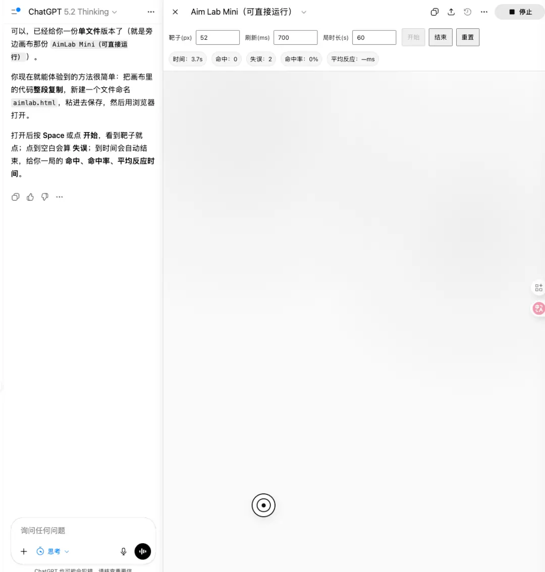 让它来写个 Aimlab (练习瞄准的小游戏)